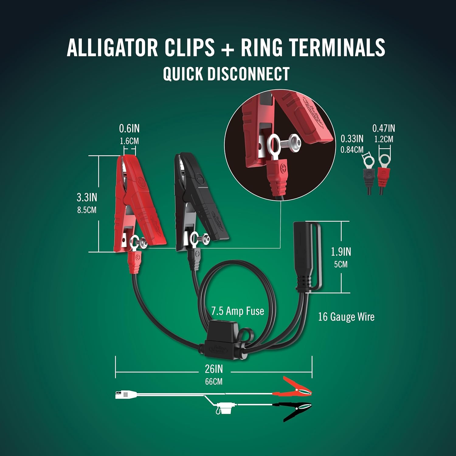 - Includes: 12V, 750mA battery charger and battery maintainer with 12-foot output cord, fused-ring terminal harness for hard-to-reach batteries and alligator clip accessory cables, 5-year warranty, and lifetime customer support