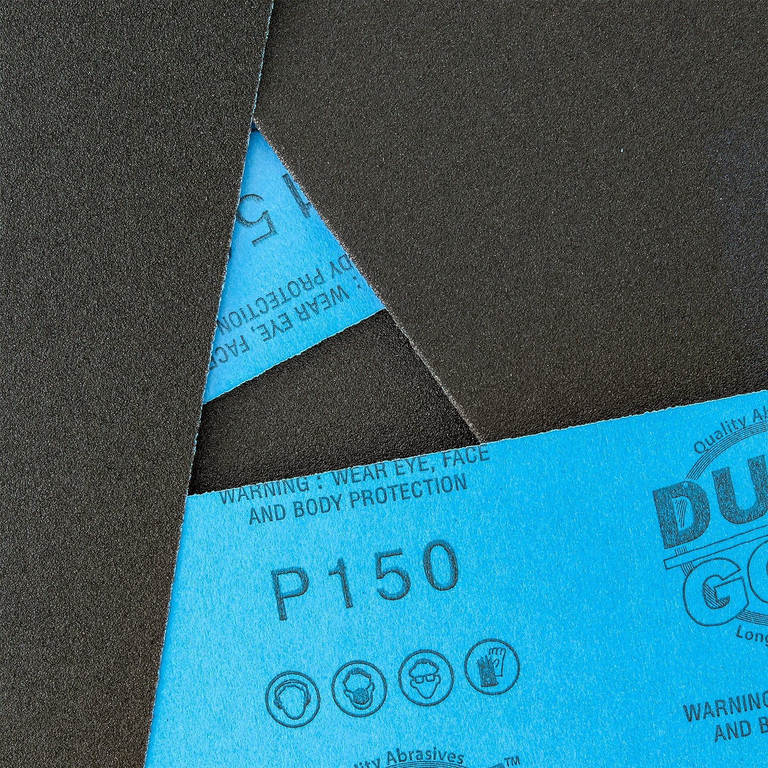 - Box of 25 Dura-Gold Premium 150 Grit 5-1/2" Wide x 9" Long Wet or Dry Sandpaper Sheets that are 1/2 of full-size 9" x 11" sanding sheets. These high-performance, durable wet or dry sanding sheets are flexible when used wet and will not fall apart, tear, or crumble while in use. Sheets are ideal for wet sanding, as wet sanding helps minimize scratches, prevents sandpaper from clogging with dust, removes loose abrasive particles, and reduces airborne dust.