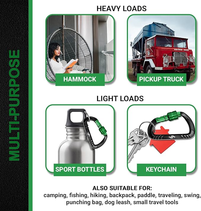- 【Multi Purpose】 Rhino locking Carabineers are suitable for: hammock, camping, fishing, hiking, backpack, paddle, traveling, swing, punching bag, dog leash, attach sports bottles, yeti sling, keychain, travel tools, fix heavy object on a pickup truck, backpack clips for kids, keychain for women, bag hook, snap hooks, key clip for men, accessory & keychain carabiners, gear ties, toy grappling hook, cable machine accessories, key holder, d ring, boxing bag. Not For Climbing.