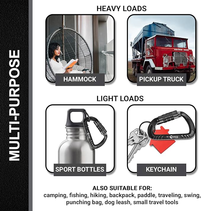 - 【Multi Purpose】 Rhino locking Carabineers are suitable for: hammock, camping, fishing, hiking, backpack, paddle, traveling, swing, punching bag, dog leash, attach sports bottles, yeti sling, keychain, travel tools, fix heavy object on a pickup truck, backpack clips for kids, keychain for women, bag hook, snap hooks, key clip for men, accessory & keychain carabiners, gear ties, toy grappling hook, cable machine accessories, key holder, d ring, boxing bag. Not For Climbing.