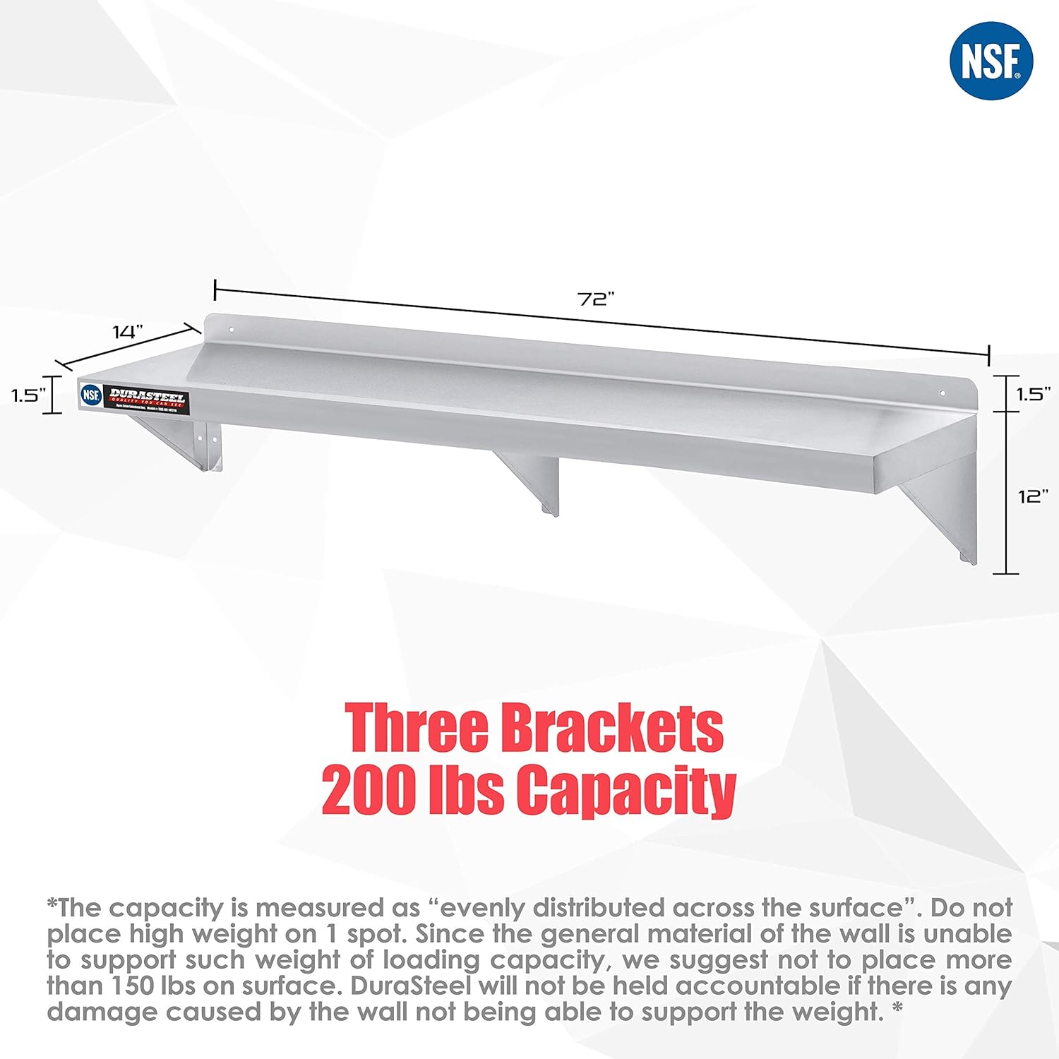 DuraSteel Heavy Duty Wall Mount Shelf - 72" Wide x 14" Deep Classic Stainless Steel Wall Floating Shelves - NSF Metal Storage Wall Shelves - For Commercial Kitchen, Laundry Room, Garage, Food Truck