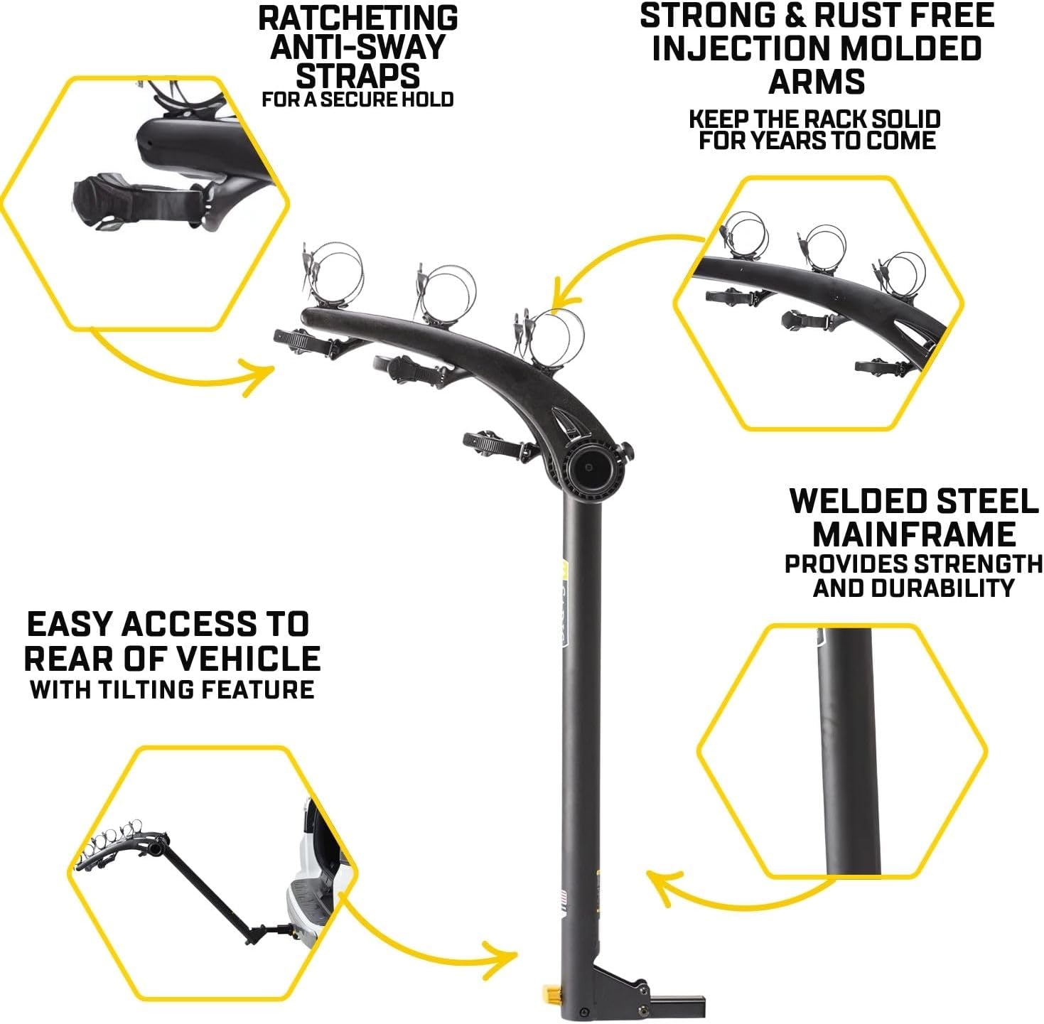 - CARRY UP TO 3 BIKES – Transport up to three bikes with ease; each arm supports 35 lbs, making it perfect for road bikes, mountain bikes, and hybrids. Total weight capacity: 105 lbs.