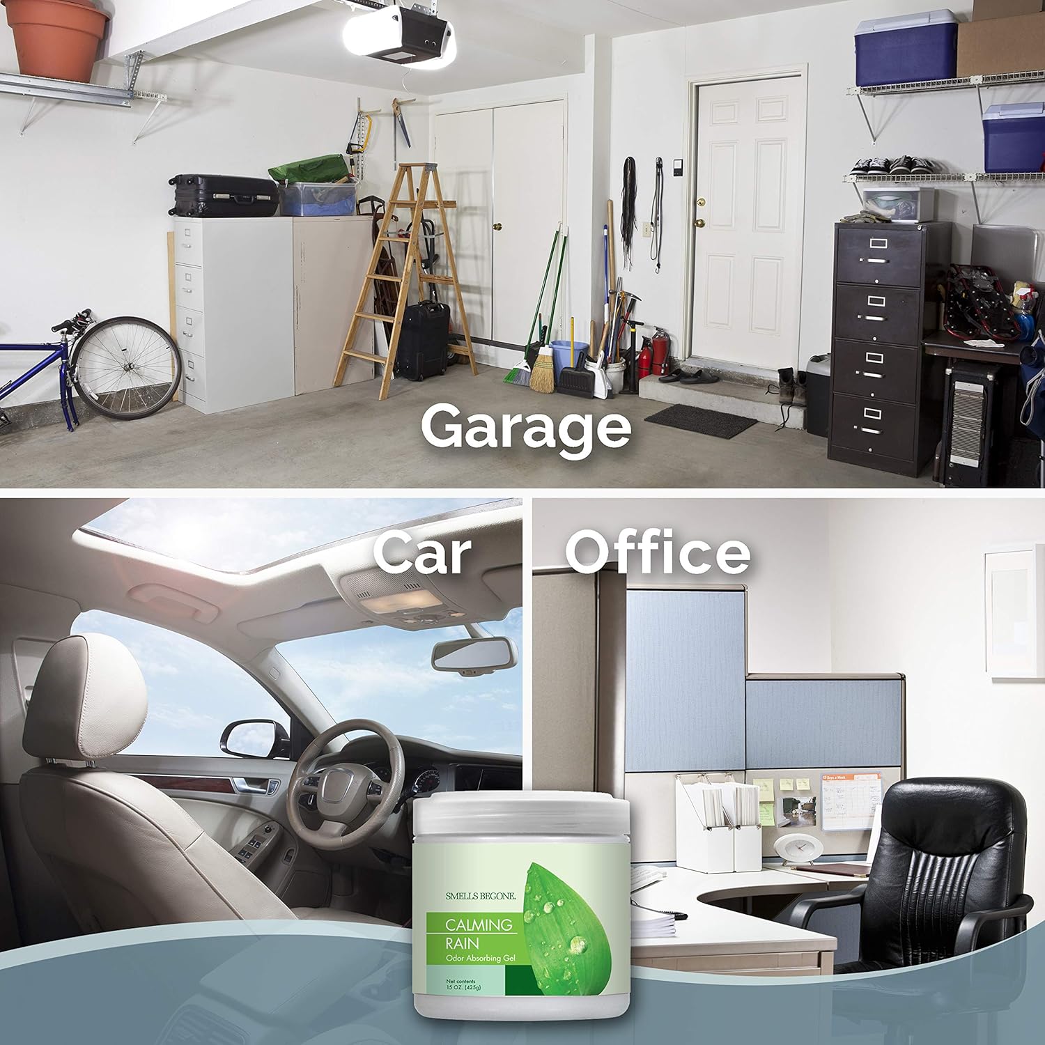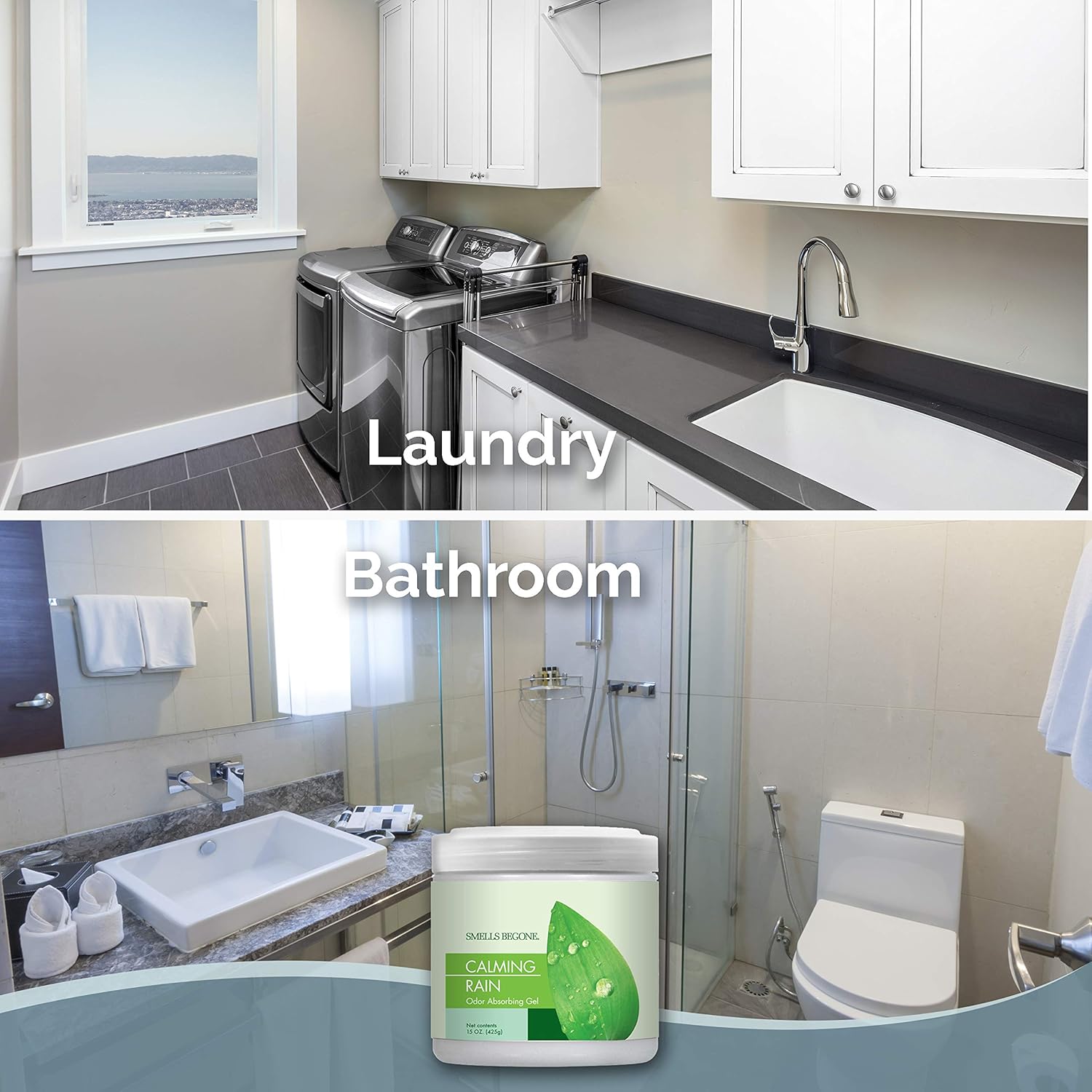 SMELLS BEGONE Air Freshener Odor Absorber Gel - 15 oz, Pack of 2 - Absorbs and Eliminates Odor in Pet Areas, Bathrooms, Cars, & Boats - Made with Essential Oils - Calming Rain Scent