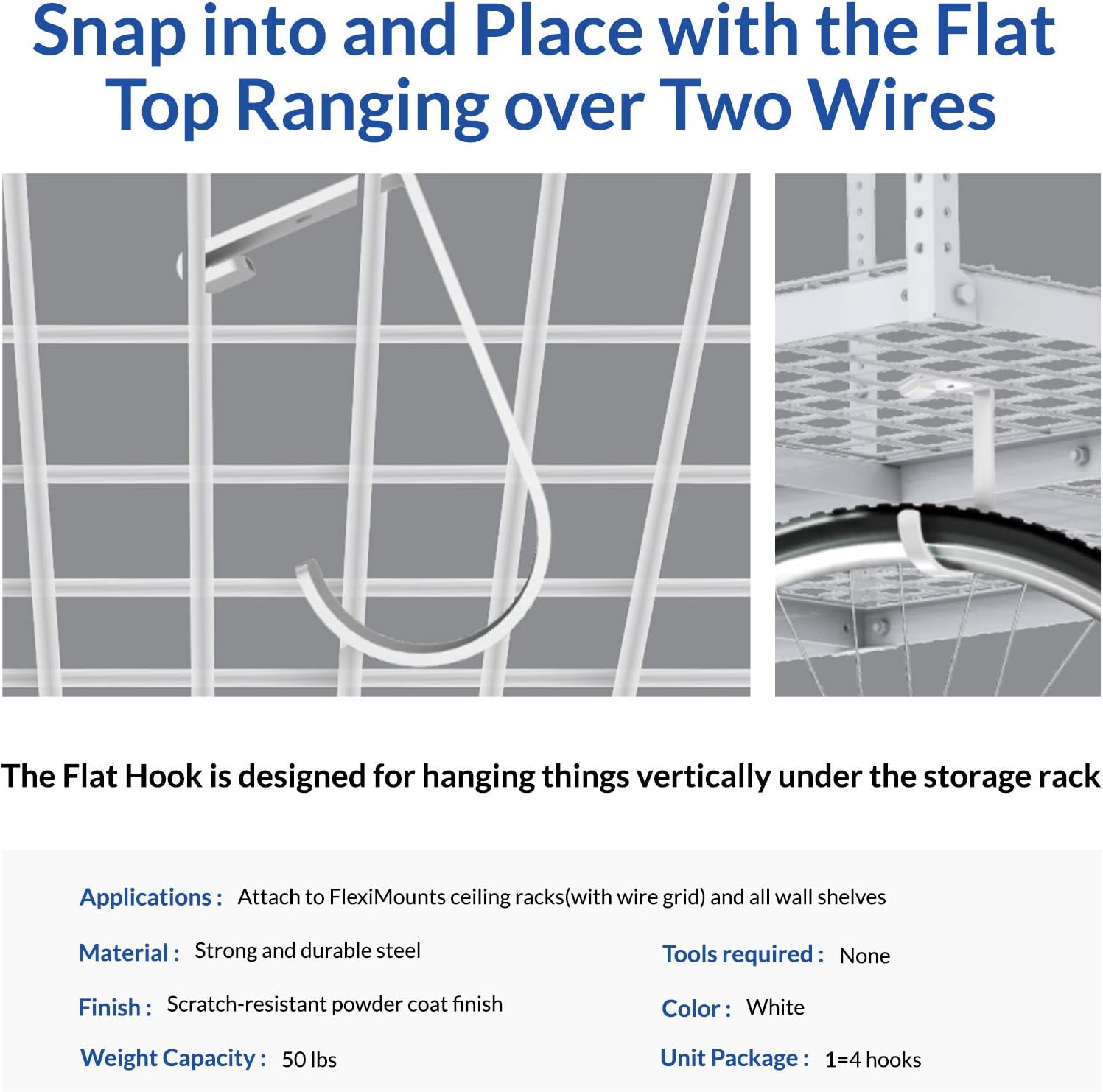 FLEXIMOUNTS 4 Pack Add On Storage Flat Hook Accessory for Garage Ceiling Rack and Wall Shelving, Max Weight Capacity up to 50lbs, White