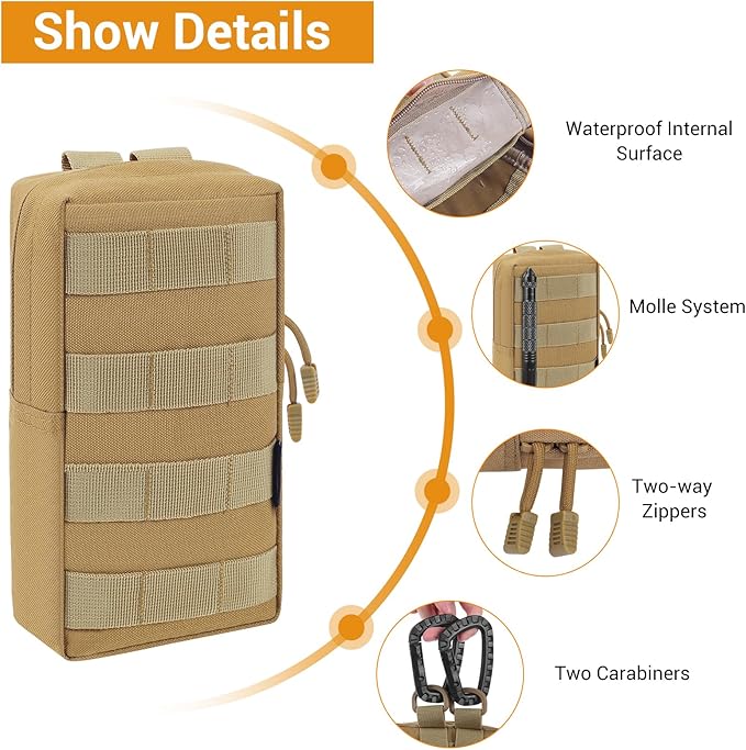 - One item includes 2 tactical pouches and 2 carabiners. Dimensions: 8.3" x4.7" x 2.2". Constructed by durable 600D nylon material and internal surface are made of waterproof material.