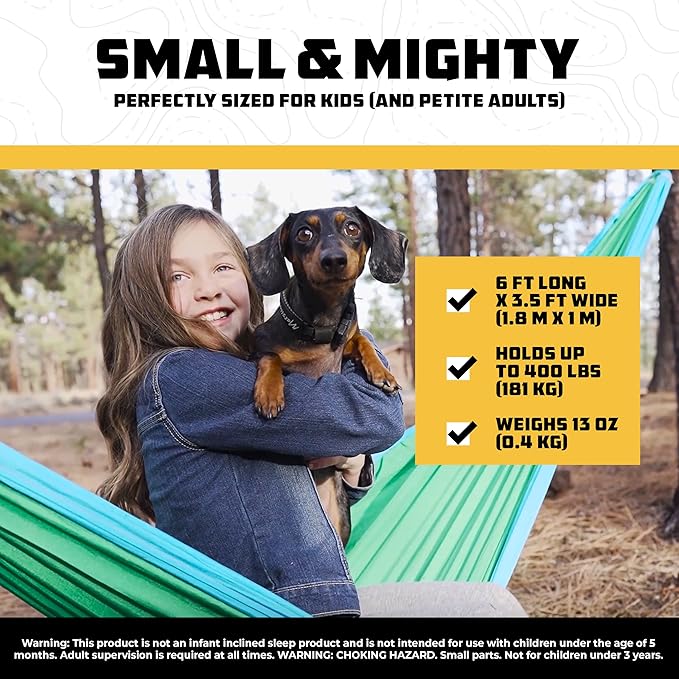 - Compact: Lightweight and convenient, our kids hammock is 6 x 3.5 ft long, weighs only 13 oz, and packs down to the size of an orange. Throw it in your backpack and go!