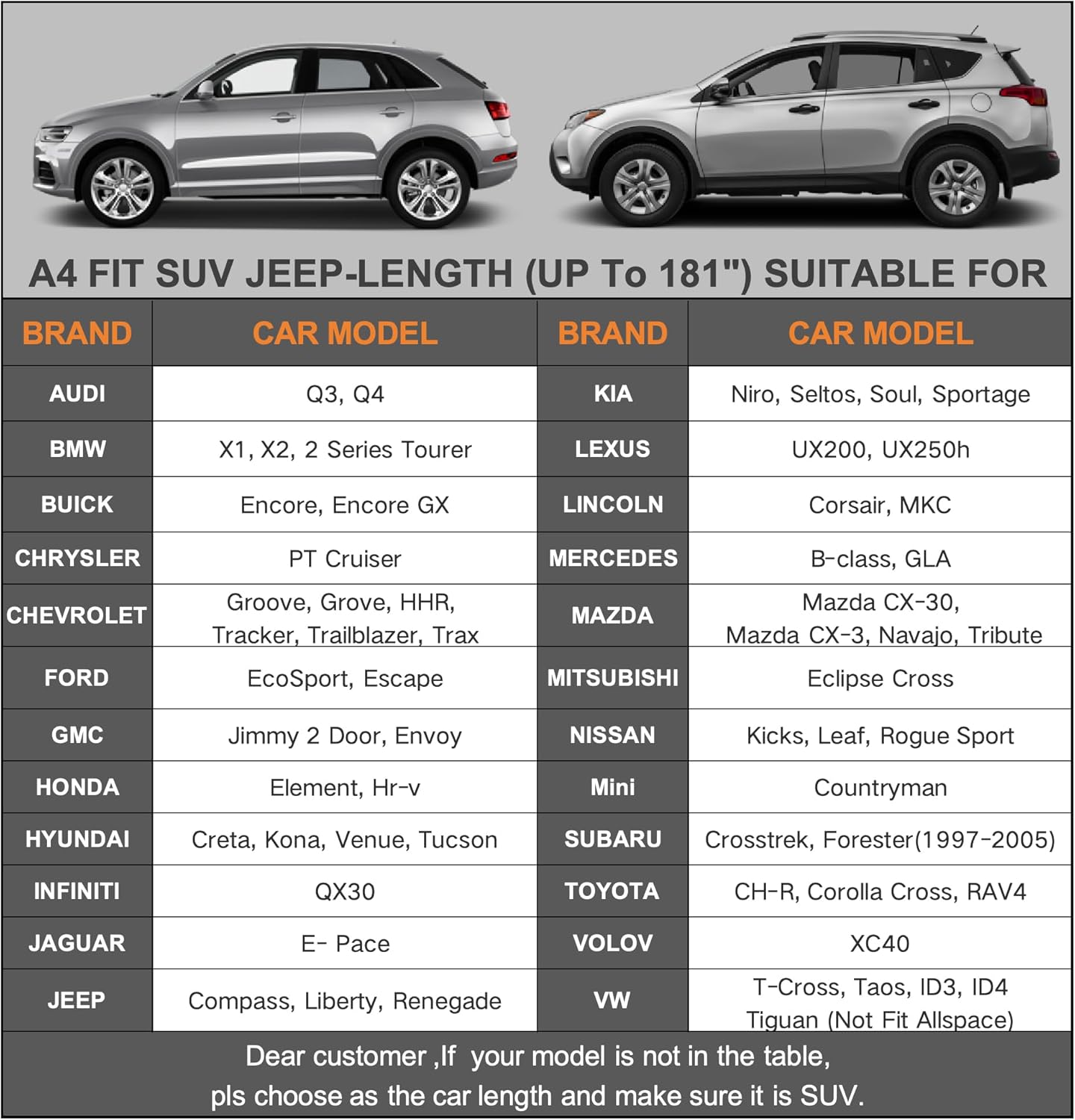 - 【Dimension A4】— Universal fit for Suv Jeep which length is up to 181 inch (NOT FOR SEDAN AND HATCHBACK). Suitable for Audi Q3, BMW X1, Honda hrv, Hyundai Tucson/Kona, XC40, Buick Encore, Jeep compass/liberty/renegade, Kia Soul/Sportage, Subaru forester/crosstrek etc.