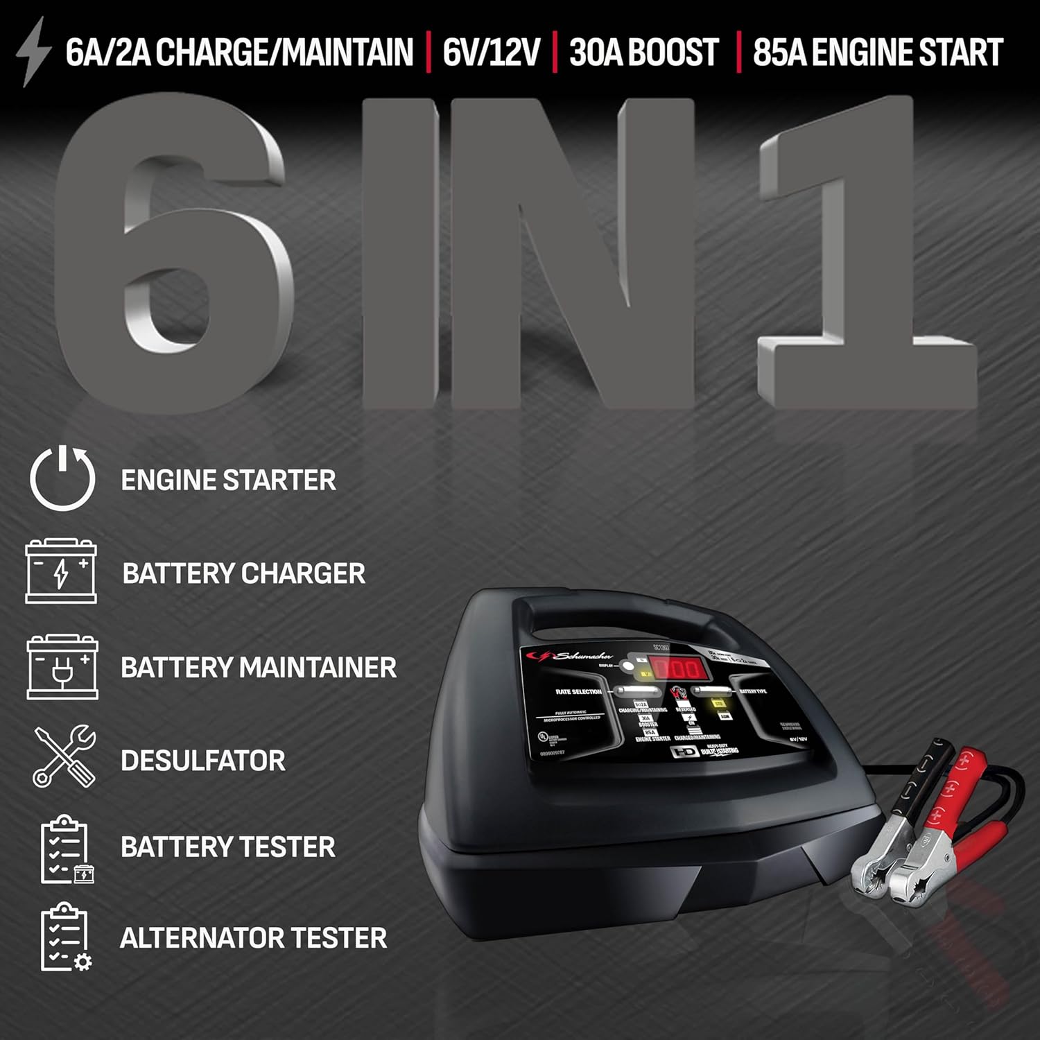 Schumacher Electric 6A Battery Charger and 85A Engine Starter, 6-in-1 Solution for 6V/12V Batteries, Maintainer, 30 Amp Boost, SC1307, for Power Sport, Car, Truck, and Marine Batteries
