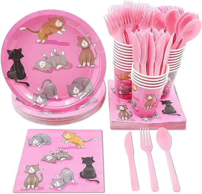 - CAT PARTY SUPPLIES: 9-inch paper plates, napkins, and paper cups feature various cats printed throughout, ideal for creating a celebratory atmosphere for your upcoming cat party