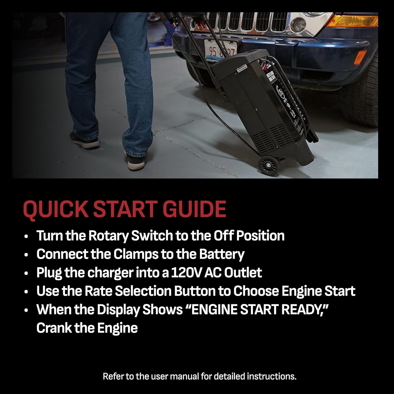 - Complete Package - Includes (1) SC1326 Fully Automatic Wheeled Battery Charger and Engine Starter, (1) user manual