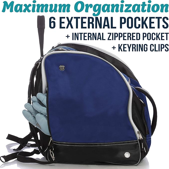 - TOUGH, WATERPROOF AND READY FOR THE SNOW - Crafted with premium water-resistant polyester, our versatile ski bag features individual side-zippered openings to slide your ski or snowboard boots in, a large compartment for gloves, helmets, goggles and other equipment, and even padded lumbar support and shoulder straps to make it all easy to carry