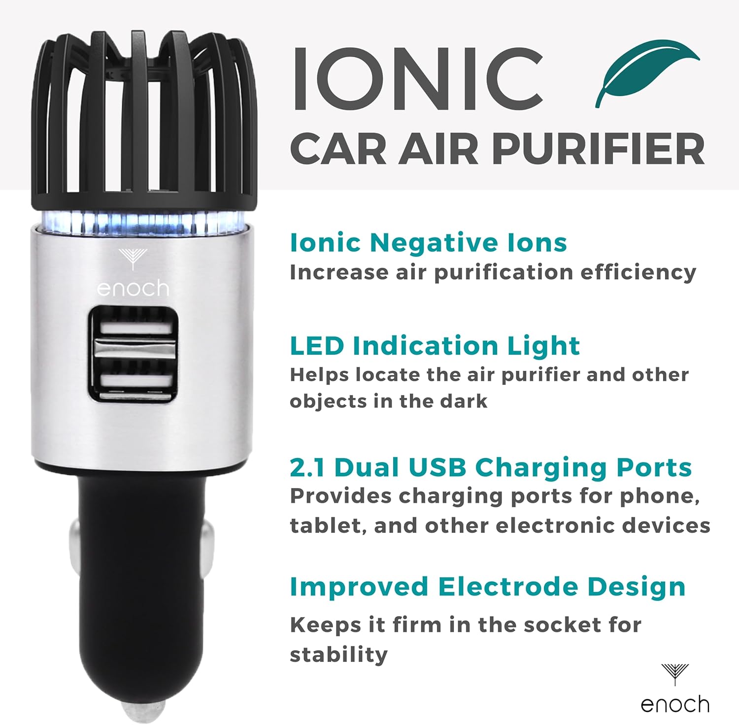 Enoch Car Air Purifier Premium Air Ionizer - 12V Plug-In Ionic Ozone Deodorizer Accessory with Dual USB Car Charger - Eliminates Cigarette Smoke, Pet and Food Odors, Dust (Gray Silver)