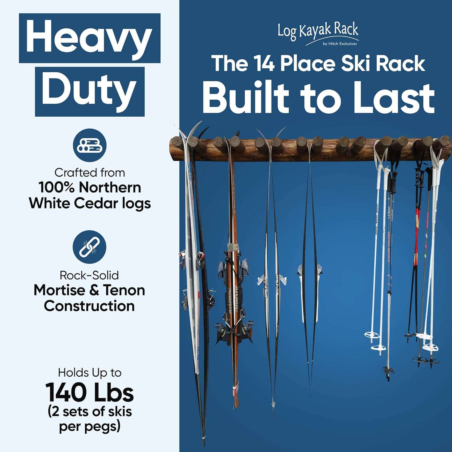 - CONSTRUCTED WITH DECAY-RESISTANT NORTHERN WHITE CEDAR LOGS - Built from the finest Northern White Cedar, this ski rack garage storage solution is designed to withstand harsh conditions, both indoors and out. The decay-resistant wood ensures that your garage ski rack wall mount remains strong and reliable for years to come. Whether in your garage, shed, or cabin, this durable ski holder wall mount offers a stable and attractive option for ski gear storage that stands up to the elements.