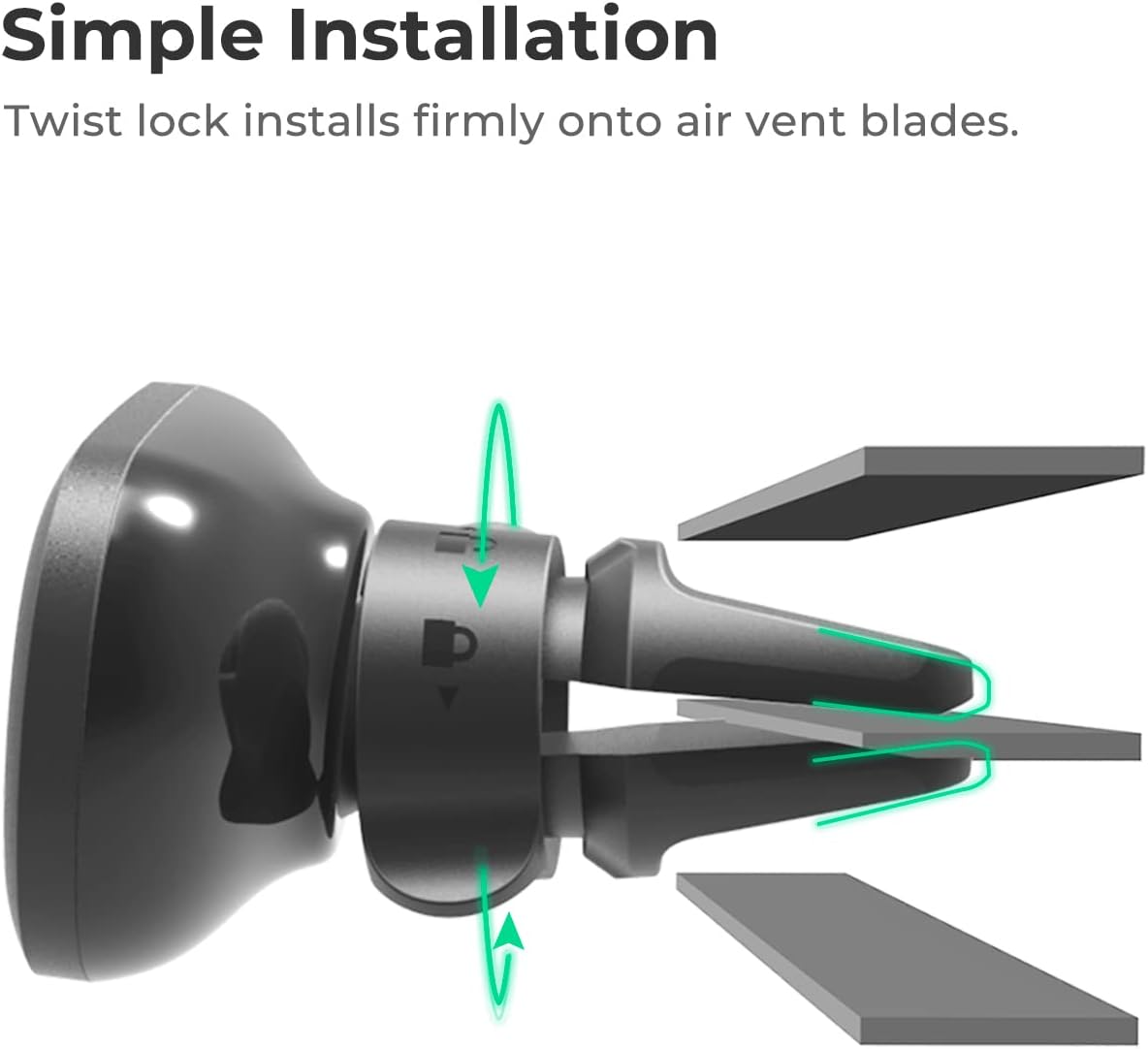 - Air Vent Mounting: Twist and lock vent clip securely fits on most air vent blades.
