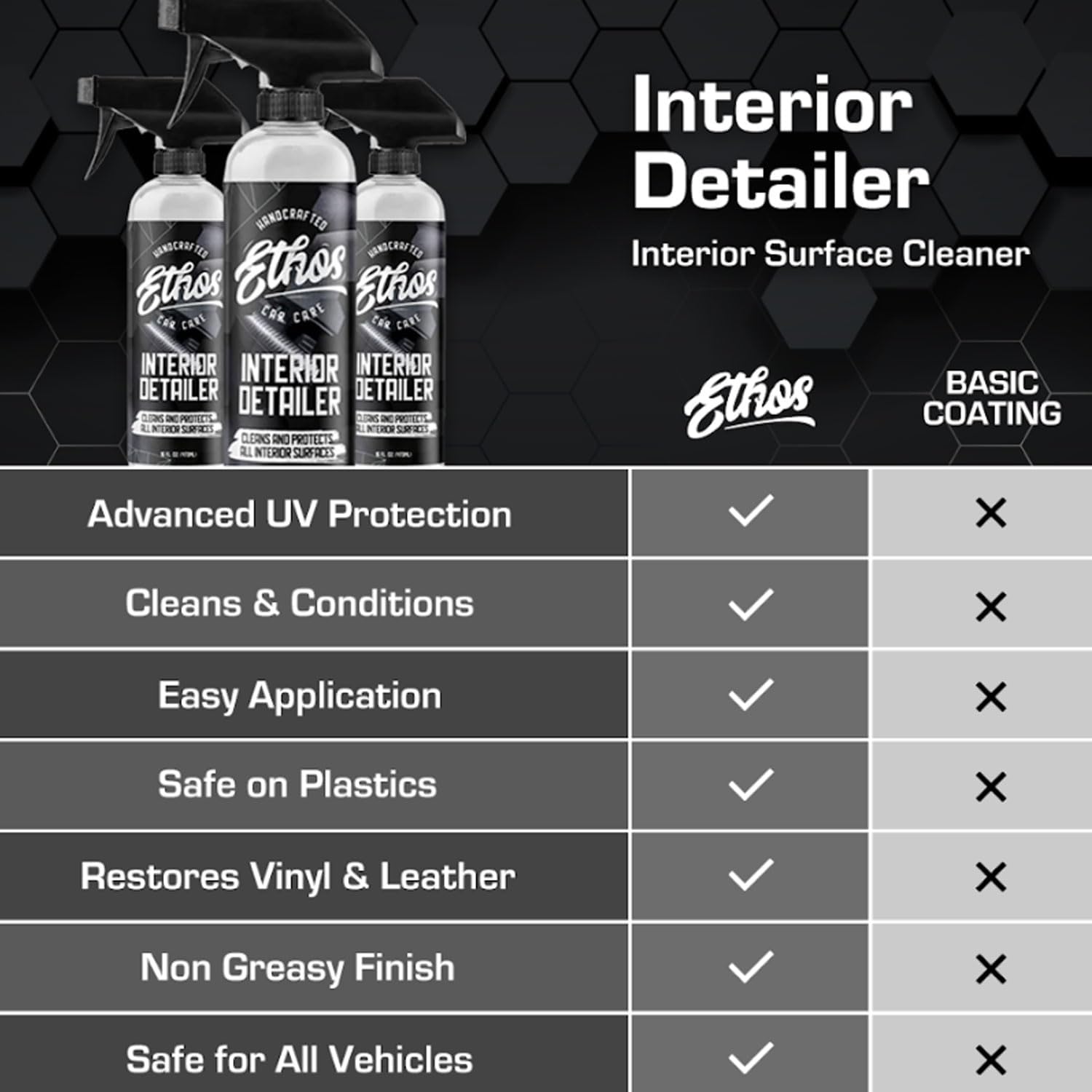 - ELIMINATE DAILY DEBRIS! Quickly remove dust, dirt, and unwanted grime from any interior surface with Ethos Interior Detailer! The perfect maintenance product to maintain your interior.