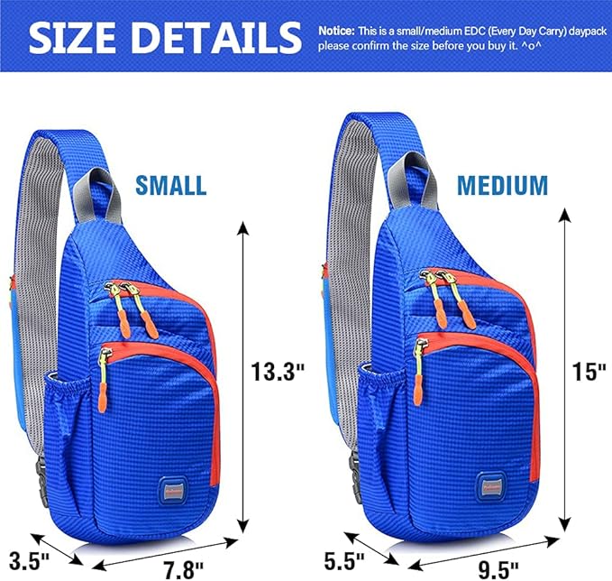 - HIGH CAPACITY WITH SMALL SIZE AND MANY PRACTICAL POCKETS - SMALL: 13.3x7.8x3.5 inches and LARGE: 15x9.8x4 sling backpack, offering large capacity for your needs. Our multipurpose casual daypacks come with many practical pockets - 1 main compartment is built in an iPad sandwich pocket, 1 Front Zipper Pocket comes with 2 interior slot pockets, and 1 Strap Pocket for your important items. 1 Side Pocket for umbrella and water bottle, etc.