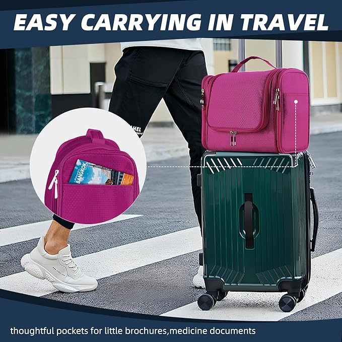 - Multiple Pockets and Compartments: The toiletry bag has more pockets and compartments than you might expect! It features 2 top mesh pockets ideal for small items like medicine and wet wipes. There is also a large main storage pocket for travel-size and normal-size toiletries, with internal compartments designed to keep liquid bottles upright. Additionally, the 2 side pockets are perfect for long, slim items such as makeup brushes, toothpaste, toothbrushes, and more