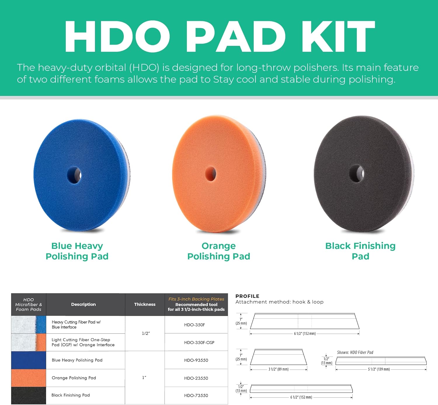- Long-Lasting: These HDO foam buffing pads for car detailing fit 5-inch backing plates using a hook-and-loop attachment and are designed for long-stroke dual-action polishers. Sturdy with tapered edges, our heavy-duty polish pads for car detailing prevent pad rolling to help minimize haze.