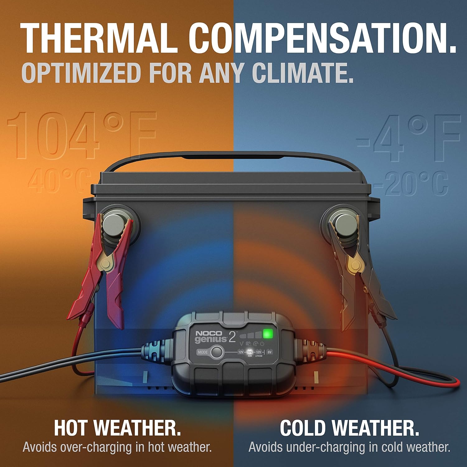 - ENJOY PRECISION CHARGING — An integrated thermal sensor dynamically adjusts the charge based on ambient temperature, preventing overcharging in hot weather and undercharging in cold, ensuring optimal battery performance.