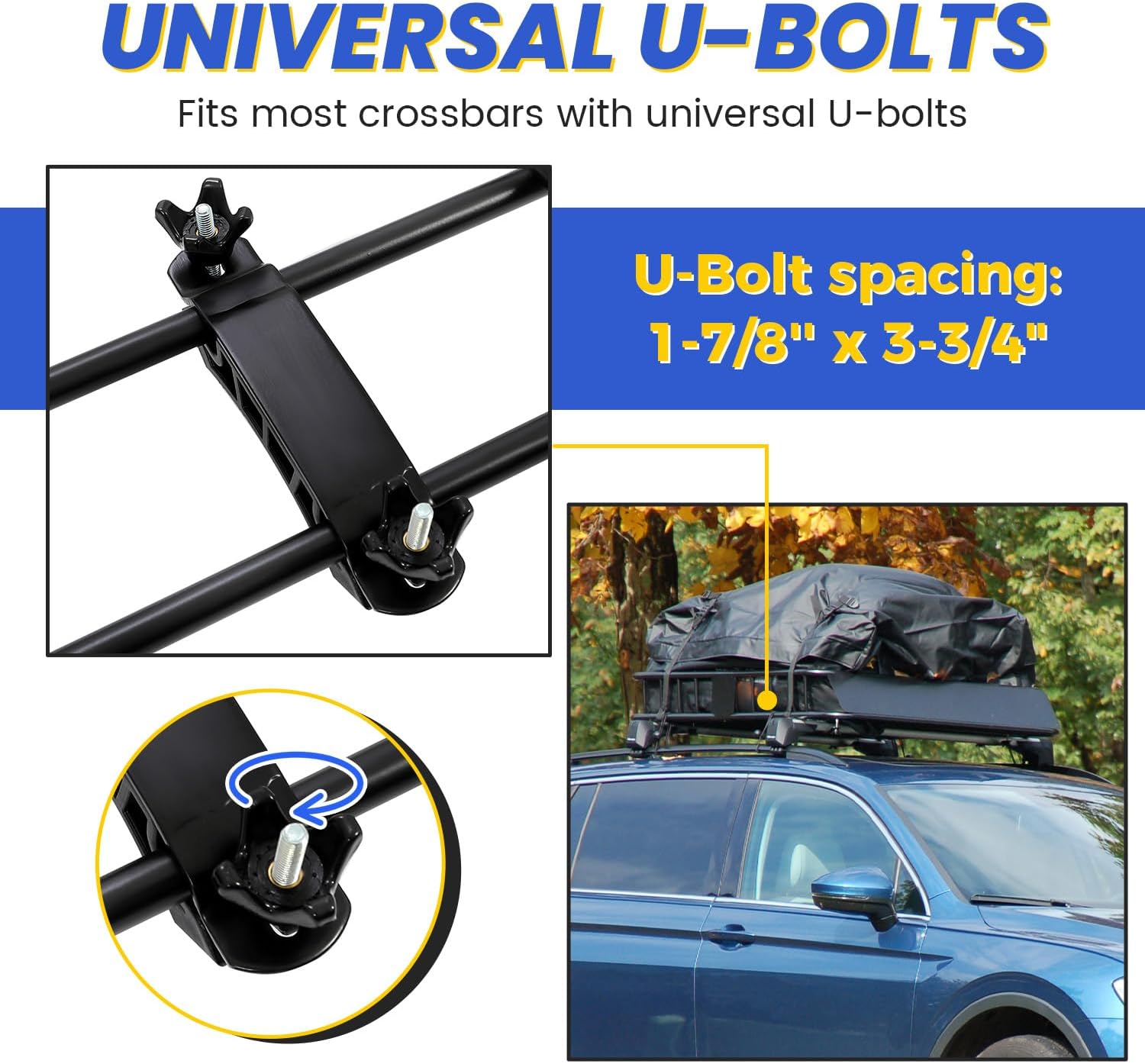 - Useful function: Use this roof rack to store hauling extra luggage, camping equipment, cargo bags and more. Built for the outdoor adventurers lifestyle. Easy to install with 4 universal U-bolts. The bottom metal bars and side rails provide plenty of tie down points. A steel wind fairing is also included. Carry big loads and mount accessories directly to the crossbars or straight bars of this roof rack cargo basket