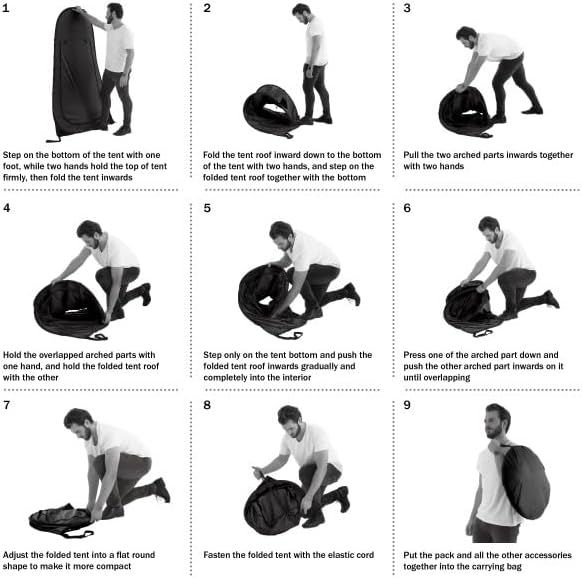 - POP UP INSTALLATION - This tent automatically pops open in seconds with no assembly required. The dual-sided zippered door of this portable shower tent can be shut for privacy or rolled and held open with the attached loop and toggles.