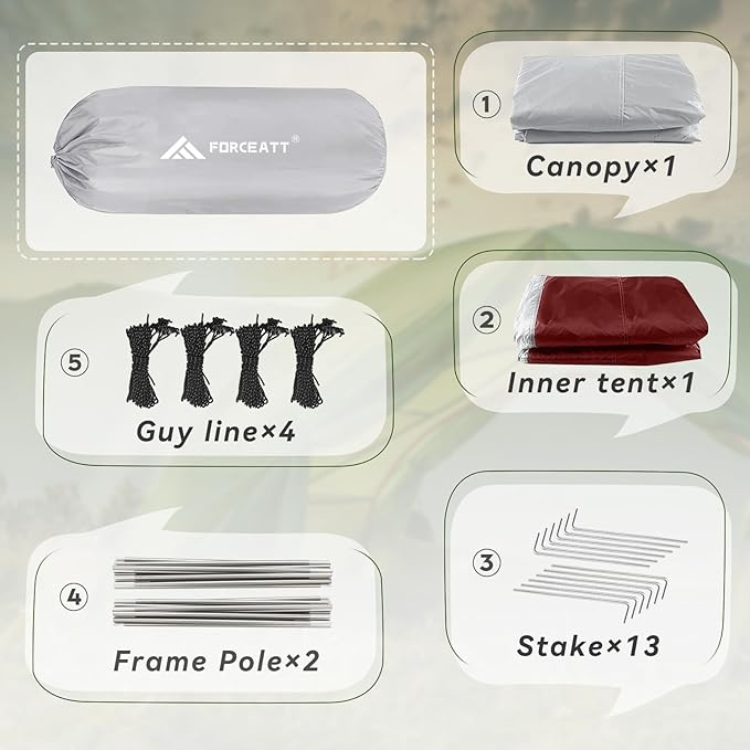 - 【LIGHTWEIGHT AND CONVENIENT】 The internal size of the Forceatt camping tent is 86.6x51.1x43.3in (220x130x110cm), which can accommodate two person at the same time. At the same time, it has a package size of 41 x 14cm and weighs 5.68lb (2.58kg), which saves space and is easy to carry.