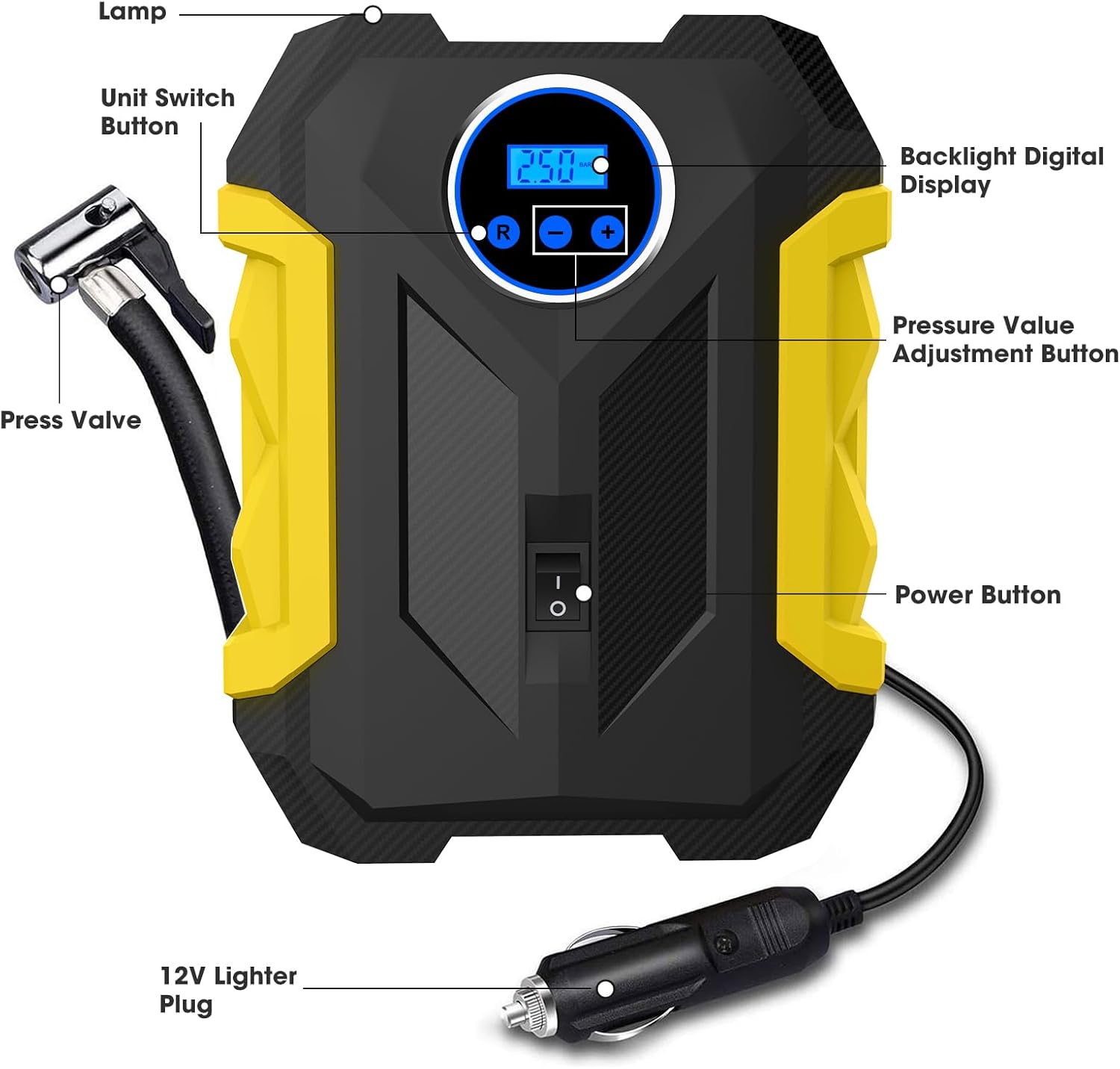 - 【DIGITAL DISPLAY & LED LIGHTING】:Carsun tire inflator is equipped with a large high-precision and high-brightness display to help you check the tyre pressure and preset the tyre presure values. The digital tire inflator is equipped with bright, long-lasting LED lights that can be easily used even in the dark.
