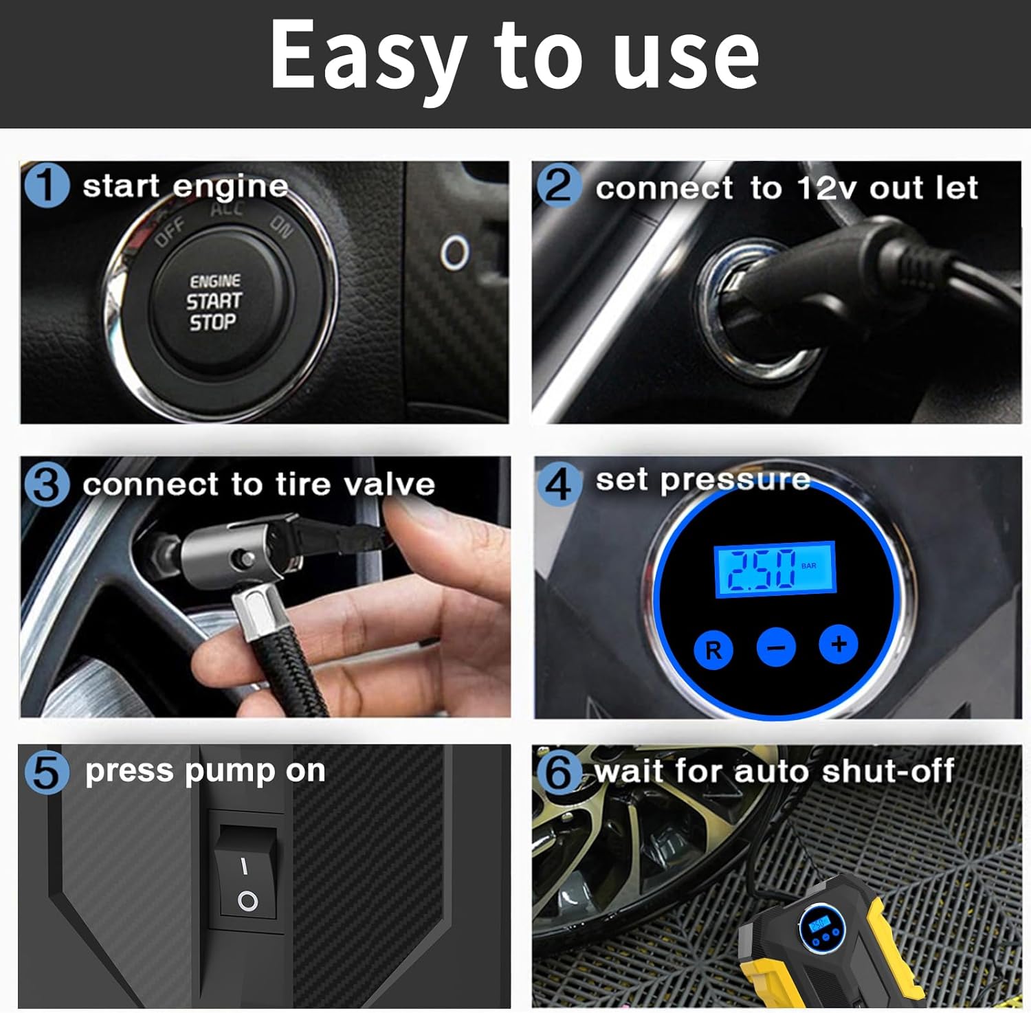 - 【EASY TO USE&AUTO SHUT OFF】:Plug Carsun portable air compressor power cable into the car's 12V power outlet, then press the inflation nozzle into the tire valve,set the pressure value required by the tire and press the switch to start inflating. The air compressor pump will automatically shut off when reaching desired tire pressure.