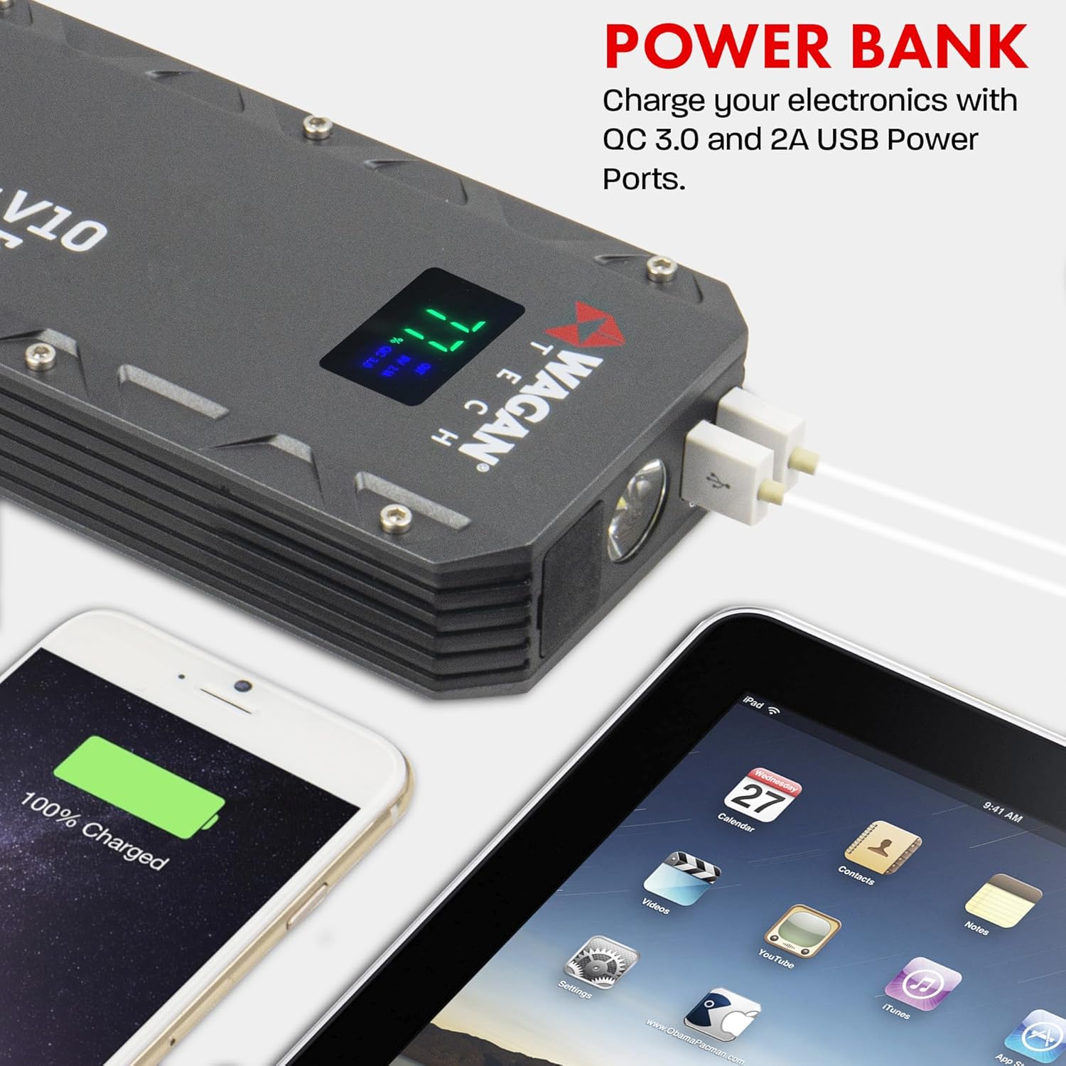 - 【GREAT JUMP STARTER WITH MULTIL FUNCTION】 - It's a car jump starter, portable power bank, and LED flashlight. It has QC3. 0 and 5V 2. 0A ports to recharge smartphones, tablets, and other US