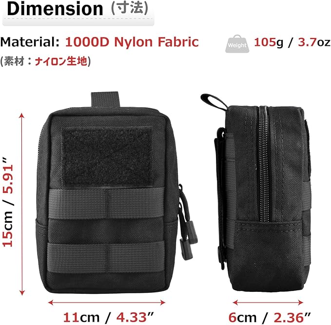 - 🐤 MATERIAL: One item includes 2 tactical bags. Large tactical bag: 6.49" x 4.53" x 1.57", made of 1000D high-density polyester material; Small tactical pouch: 5.91" x 4.33" x 2.36", made of 1000D high-density nylon material. Both have better tear resistance and water resistance