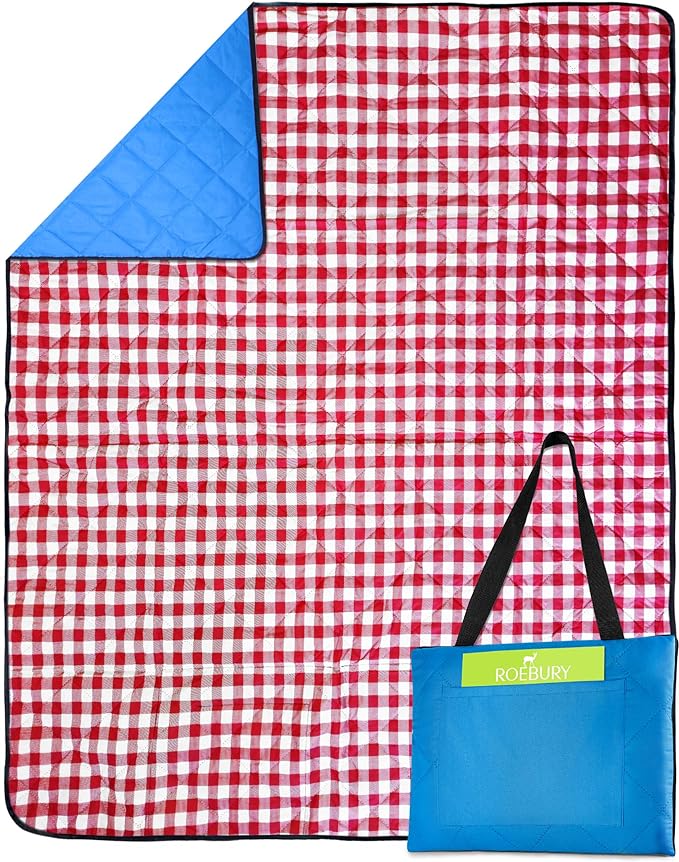 Beach Blanket Sand Proof & Outdoor Picnic Blanket - Water Resistant, Large Mat for Camping or Travel. Washable, Foldable, Easy Carry Compact Tote Bag (Checkered Red/White)