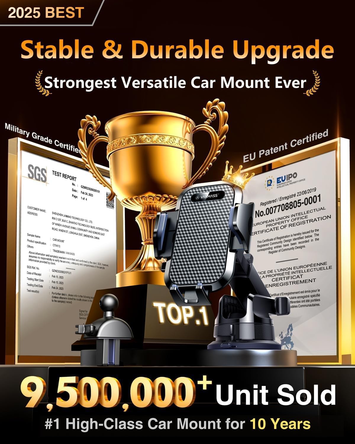 - 【Pro Version:VANMASS's Best Choice】VANMASS has been dedicated to car phone holder for 8 years, always leading the car holder industry in all aspects: safety, stability, durability, compatibility, multi-scene adaptability,climate friendly. The pro version mount enables the cutting-edge design team to create the best choice for customers- highest rating, most customers' preference, EU Intellectual Property Patent (No.007708805-0001), Military Grade Cert (No.GZMR220601855501), CP65/REACH/ROHS