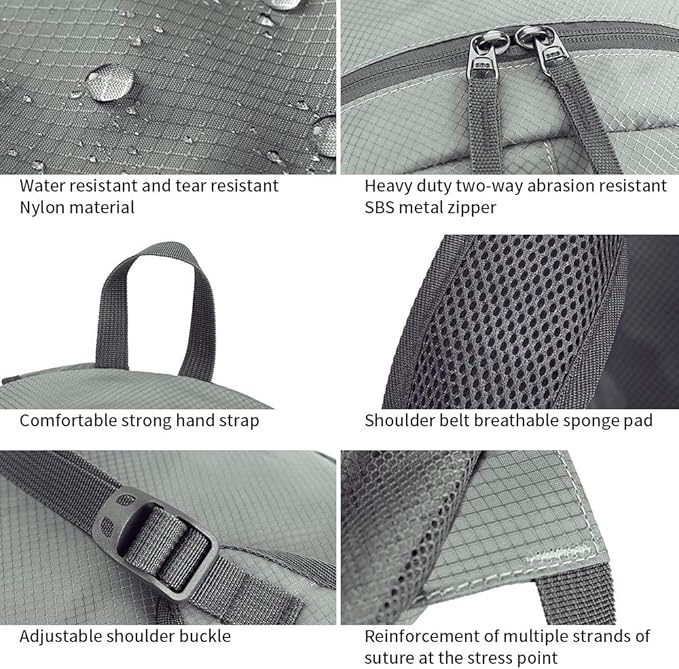 • 【INCOMPARABLE QUALITY】Ultra-durable and Light with weight only 0.78 pounds.This backpack is made of high quality tear and water resistant nylon fabric, Heavy duty two-way SBS metal zippers and enhanced by bar-tacks at major stress points provide long-lasting durability against daily activities.The extra strength provided by the double-layer bottom piece makes it possible to carry more stuff.