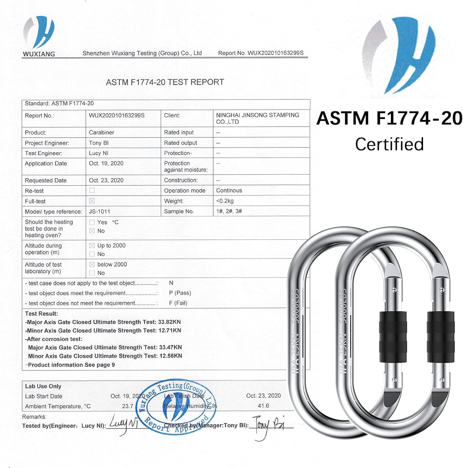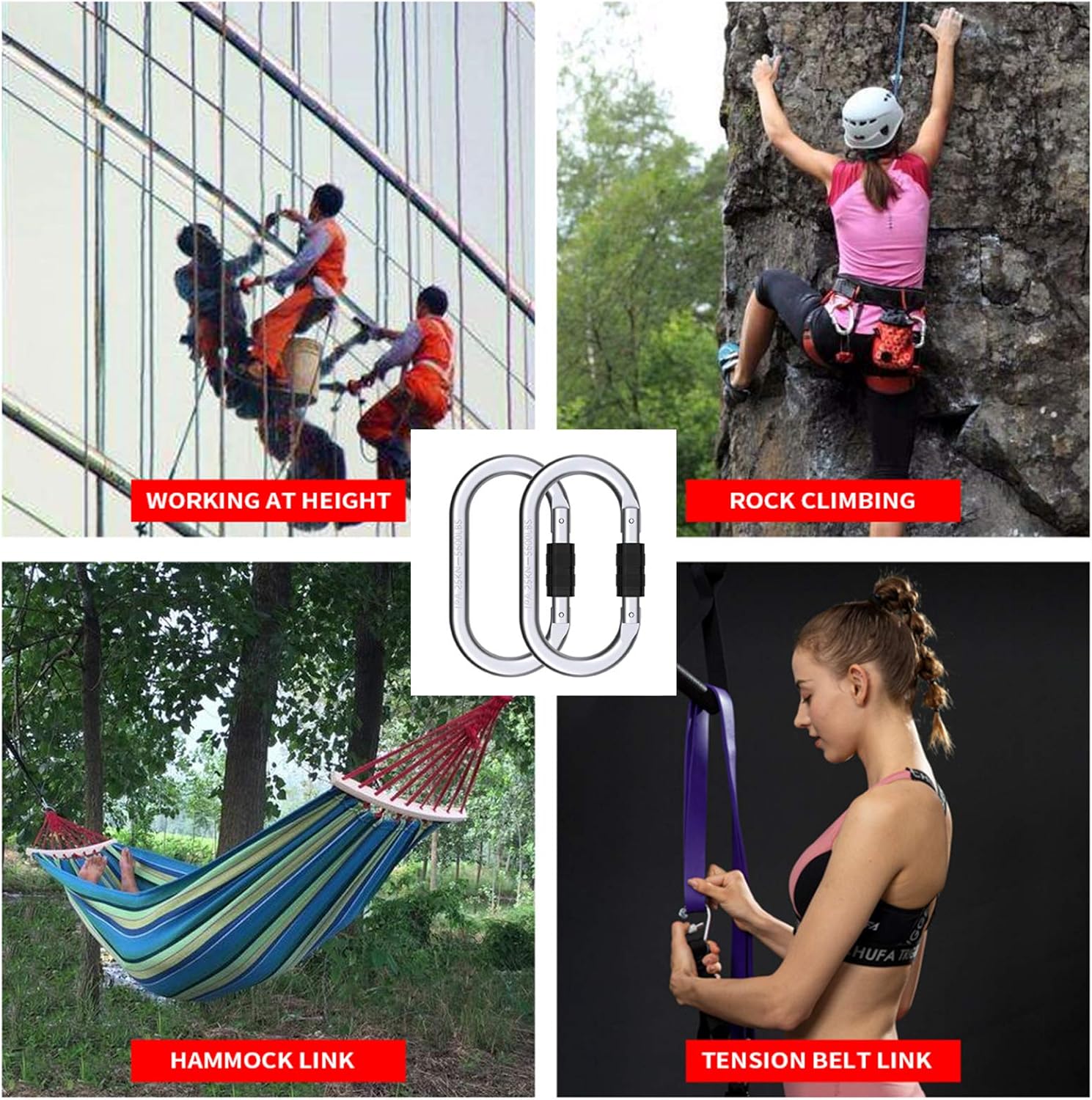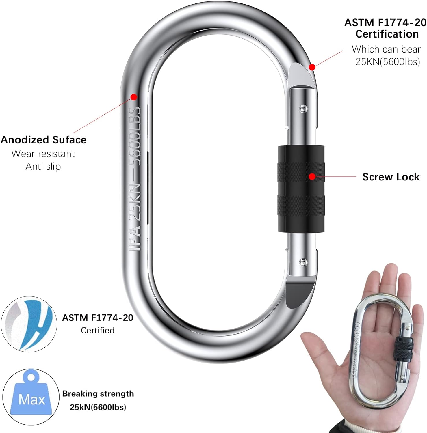 - 【Specifications】Large carabiner with heavy CE certification,which can bear 2500kg(5600lbs),The sizes about 4.29in*2.32in (opening 0.748in).Suitable for various sports connecting ropes outdoors and indoors.