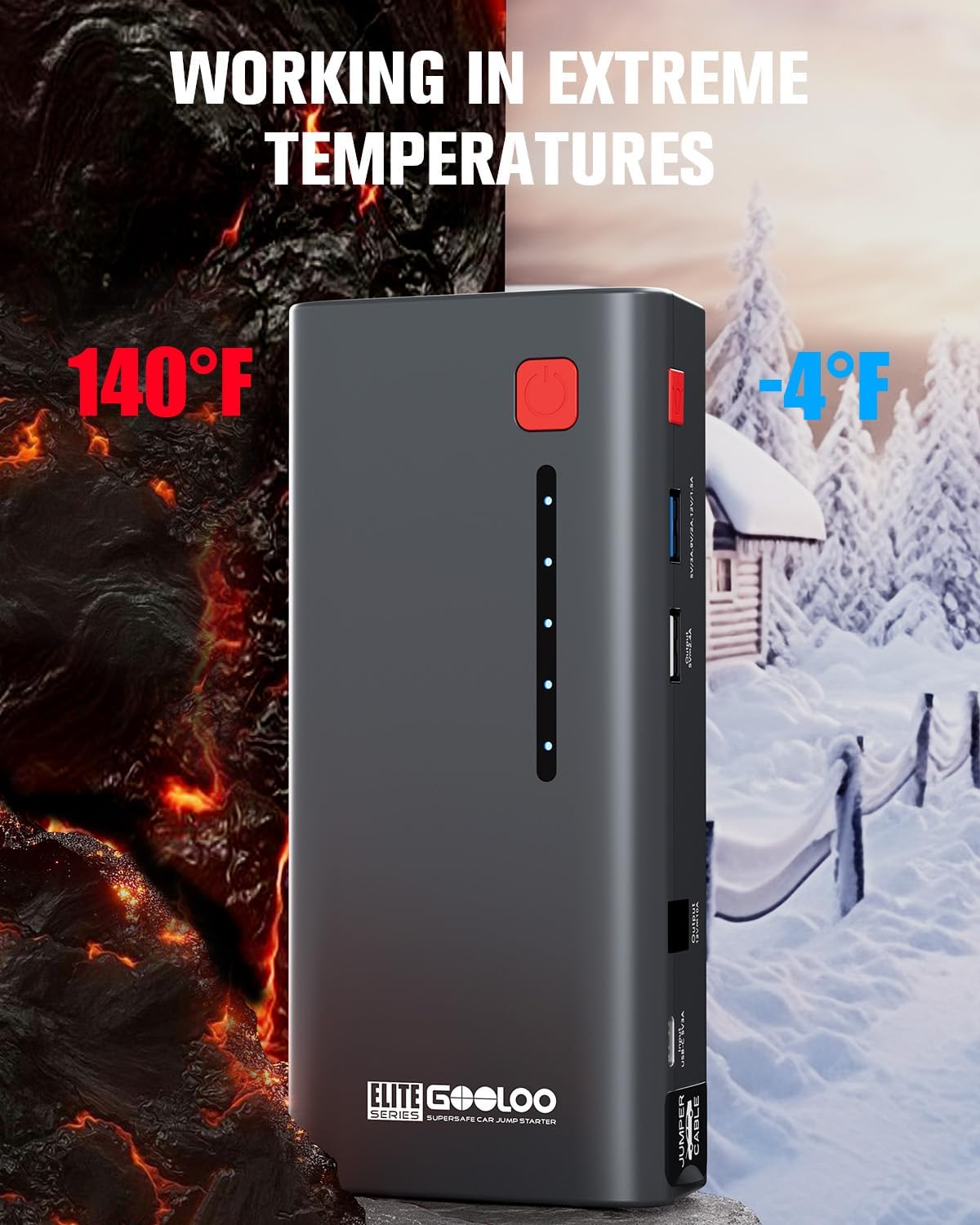 - AFFORDABLE AND POWERFUL- Get an all-in-one car bettery starter, power bank and LED flashlight at an affordable price. The performance of this GOOLOO portable car battery jump starter power pack was just as capable as many of the high-end model and can meet the needs of most people.