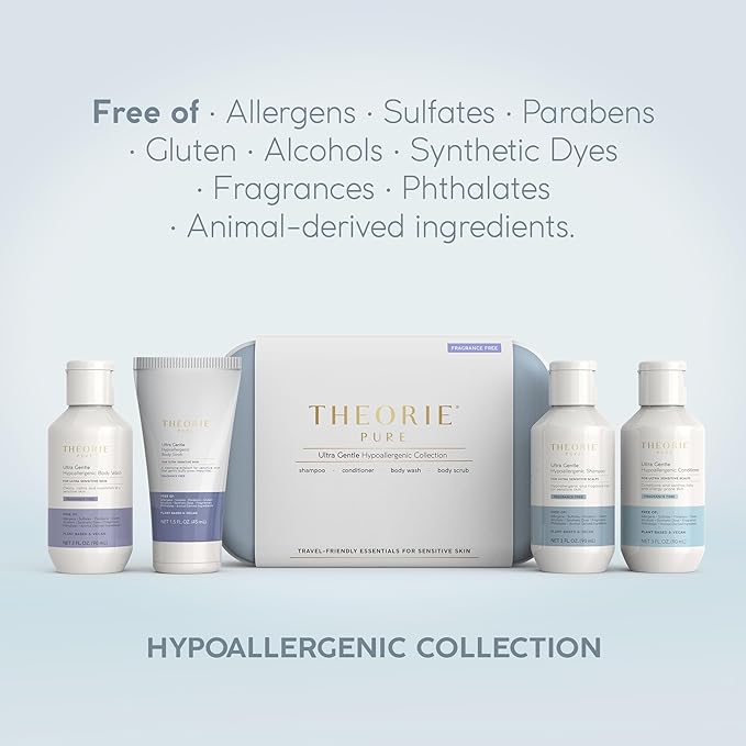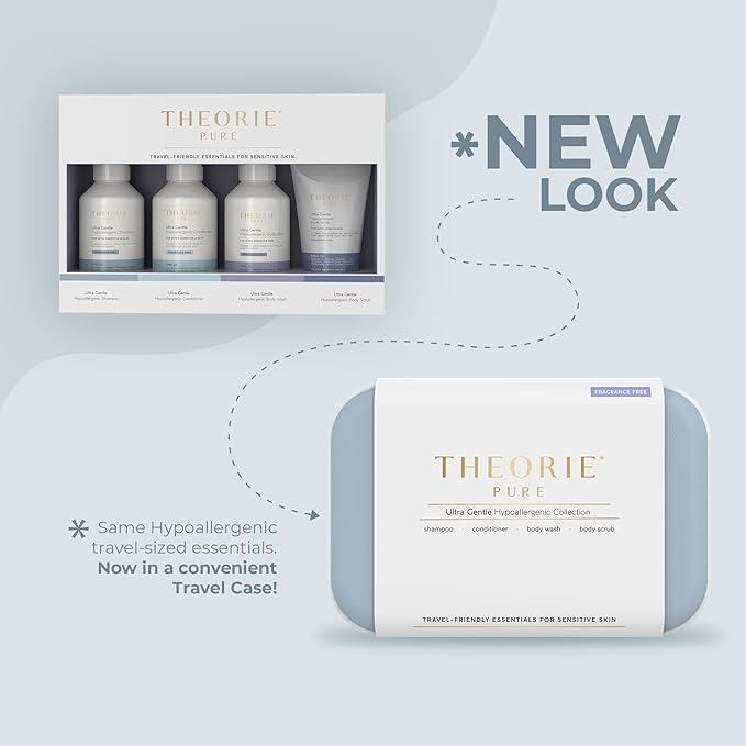 THEORIE PURE Travel Size Toiletries Set - Hypoallergenic Shampoo, Conditioner, Body Wash & Body Scrub - Fragrance-Free, No Sulfates or Parabens - Clean Beauty Essentials for Hair & Skin