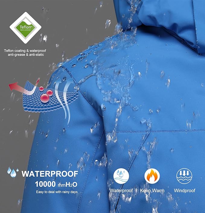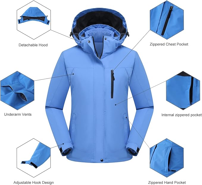 - Windproof & Waterproof - The shell jacket women is made with anti-water, grease, and 100% 75D*150D polyester fabric with 10000mmH2O waterproof index. This windproof waterproof designs of this womens 3 in 1 ski jacket features with a detachable hood, adjustable drawstring, elastic cuffs, and YKK zippers. It's worth noting that the womens jacket Will effectively seals warmth while keeping you security from ice cold gusts of wind.