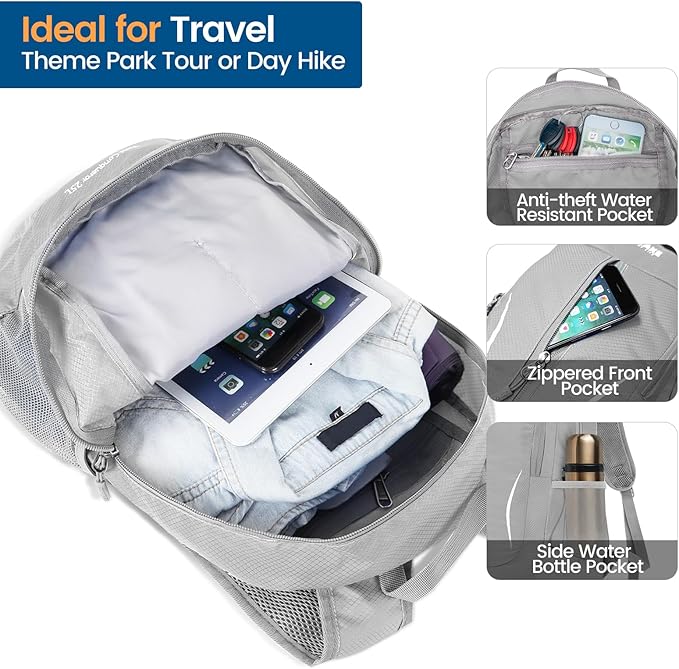 - Reasonable and Orderly: Our ultralight packable backpack capacity is 25L,and the pocket structure layout is reasonable and orderly.One main bag can accommodate sandwich lunch boxes and inner partitions to accommodate A4 paper size files;One inner bag can store important small items such as passports;2 front bags can store small booklets such as travel guidelines;2 side bags can store water bottles and umbrellas