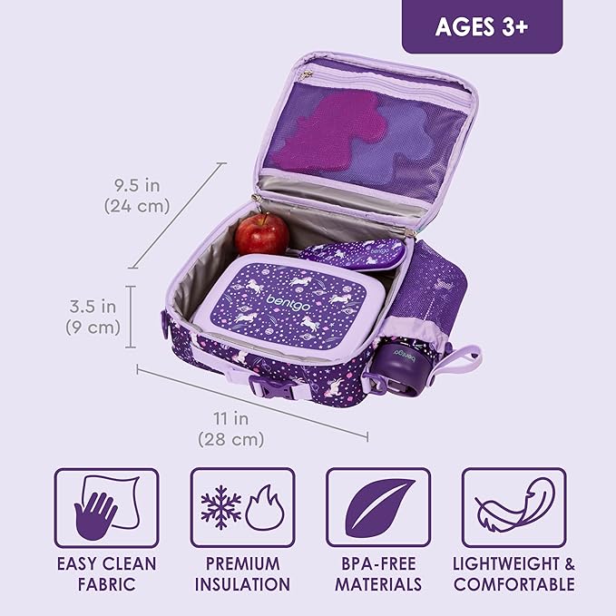 - #1 Lunch Bag Brand: Designed with premium materials, detailed finishes, and ultra-thick, double insulation that keeps your child’s meals fresher for longer while on the go. Bentgo Kids Lunch Bag is sized to transport both meals and snacks between school and activities for Ages 3+. Plus, our industry-leading 2-year manufacturer’s warranty protects your purchase for long-lasting use.