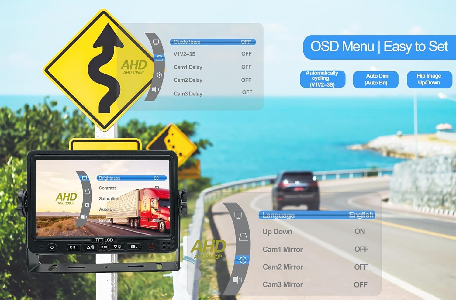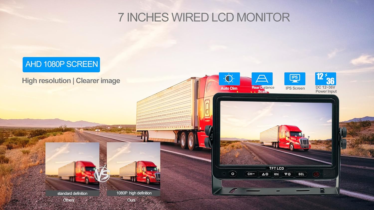- Key Features:(1).Upgraded Industrial-Grade Chipset: Ensures reliable performance and durability for various vehicle. (2).10G Vibration Resistance: Withstand intense vibrations,making it ideal for heavy-duty vehicles and extreme conditions. (3).7” AHD 1080P Monitor: Delivers crystal-clear, high-definition visuals with 1080P resolution. (4).Heavy-Duty AHD 1080P Camera: Features a 120 degree viewing angle, IP69K waterproof rating and night vision for optimal performance in all weather conditions.