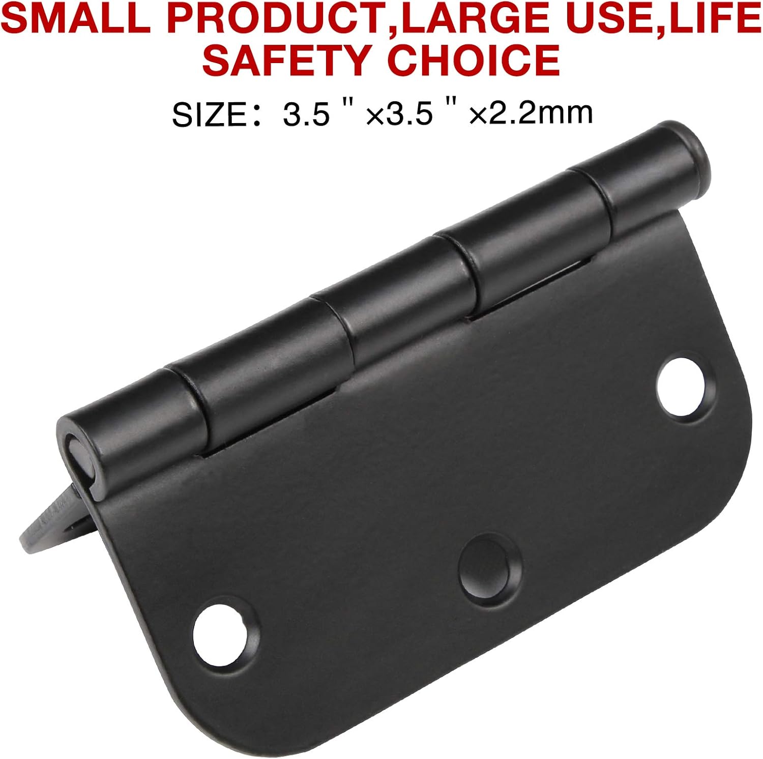 - Door hinges Black Matte 3.5 inch with 5/8 rounded corners and 6 holes for front door, cabinet, wooden box. Safe black door hinges 3.5" Includes 108 free screws for quick and easy installation. Mat black door hinges can be rotated 270 degrees.