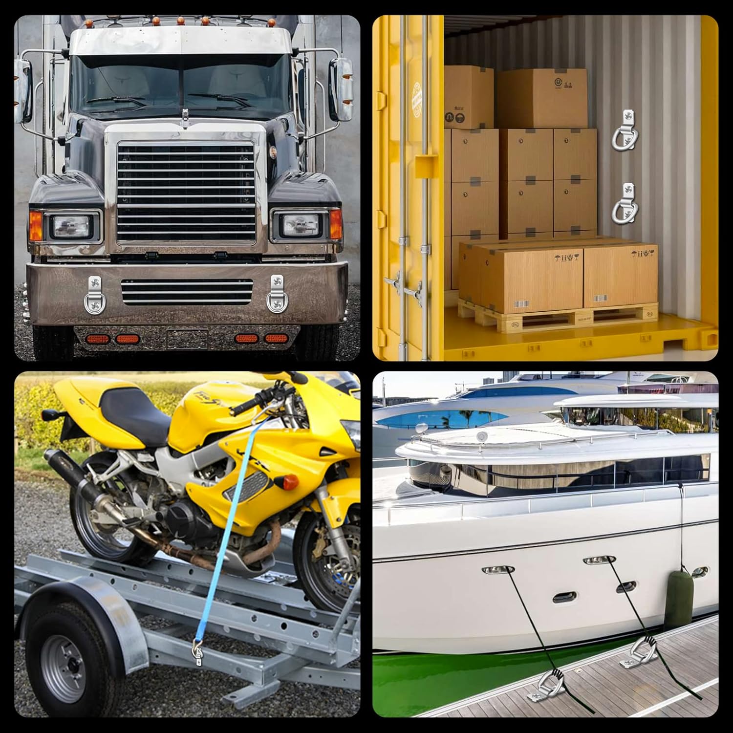 - Once these D-rings are mounted, you can use them as tie-down anchors for motorcycle straps, bungee cords, tarp straps, small chains, ratchet and cam straps, ropes, and other tie-downs. Ideal for securing kayaks, ATVs and other powersport equipment, bikes, refrigerators and similar appliances, delivery and moving boxes, camping gear, etc.