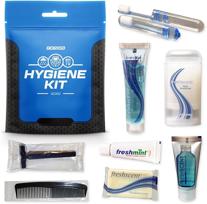 Travel Toiletry Kit, Hygiene Kit with Shaving Supplies for Travel, Business & Charity with Reusable Toothbrush, Bath Soap & Other Essential Toiletries, 3-Pack