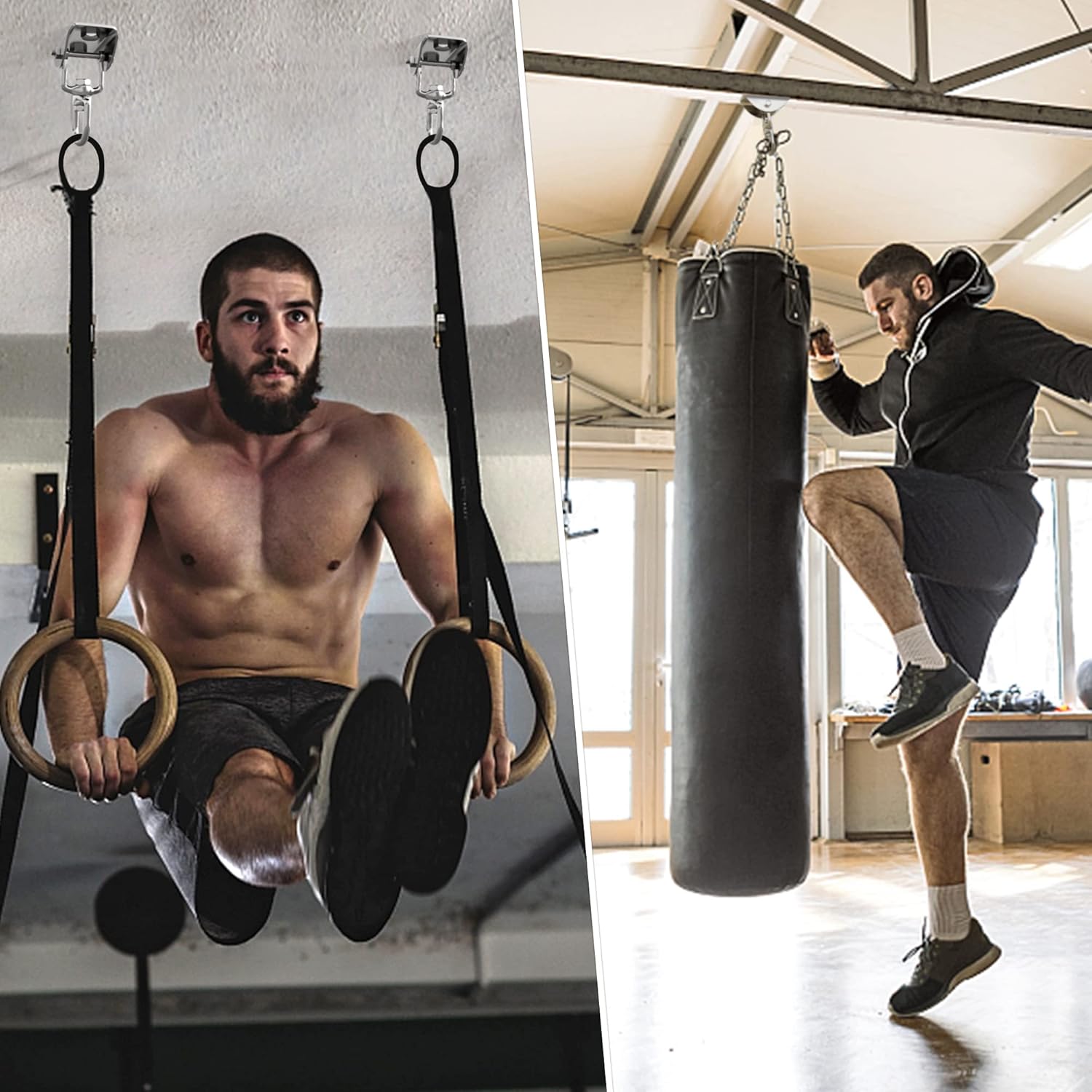 - 360°Rotable Ring & Silent Design : Our swing hangers contain Nylon Wear-Resistant Gaskets on both sides to Prevent direct Friction and Noise;360°Rotated freely, perfect for Punching Bag and some Yoga Exercise.