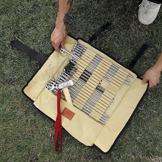 - A Cotton Canvas Storage Bag to GET YOUR TENT STAKES AND HAMMER ORGANIZED:You can put 20pcs of tent stakes and a hammer in this storage bag. Tent stakes should have less than 13.78’’/35cm length. There is a inner pocket for hammer.
