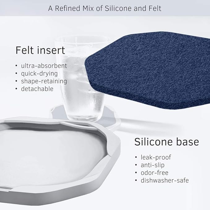 - HYBRID SILICONE AND FELT - It combines the best of both materials for a lightweight yet durable, all-purpose coaster. The non-slip silicone base keeps your cups in place while the super absorbent felt pad soaks up any moisture from your glass. In addition, the case has a lip with charming reliefs around the edges, which nicely frames the tailored insert, preventing it from popping up