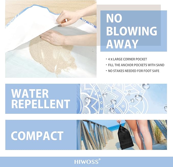 - 🌊【UNIQUE DESIGN, 4 CORNER POCKETS】The eye-catching designed beach blanket, with quality in appearance, will make you stand out on the beach! You can easily find your family and friends on the beach without worrying about getting lost. At the same time, the beach mat is designed with four built-in corner pockets that prevent the blanket from blowing away.