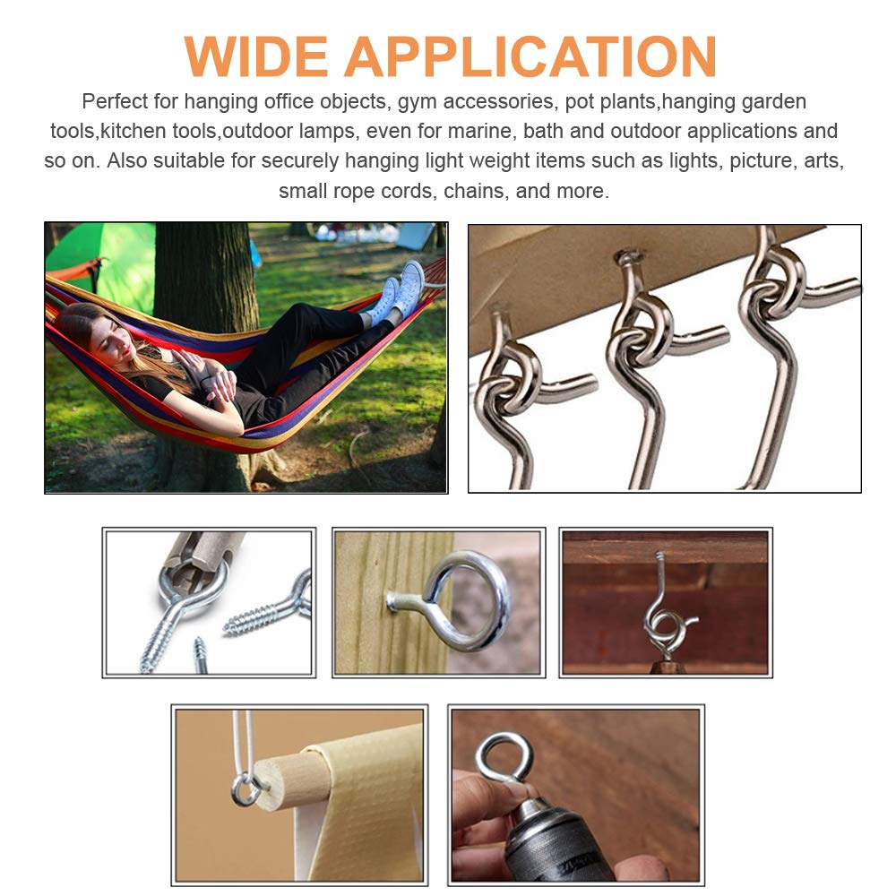 - 【WIDELY USED】Generally used to attach cables, chains and ropes in concrete and wood surfaces. Perfect for hanging office objects, gym accessories, pot plants,hanging garden tools,kitchen tools,outdoor lamps, even for marine, bath and outdoor applications and so on. Also suitable for securely hanging light weight items such as lights, picture, arts, small rope cords, chains, and more.