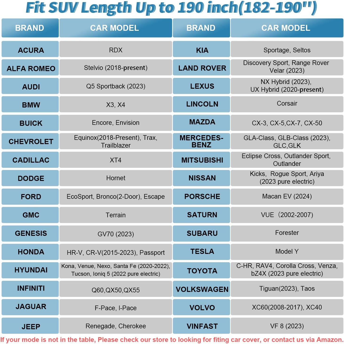 - Universal Custom Fit: Designed to accommodate a broad range of SUV sizes with dimensions of 191x75x73 inches (485x190x185 cm), our car cover ensures a perfect fit for most SUV models, including the Toyota Highlander, Honda Pilot, and many more. For exact matches, refer to the vehicle list provided in the images section, or use our detailed sizing guide to measure your SUV, guaranteeing a flawless fit and optimal protection for those searching for universal car cover or car cover suv