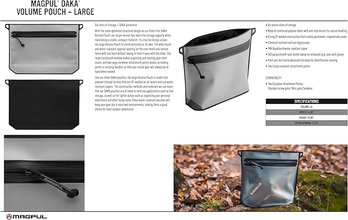 - With the same optimized structural design as our three-liter DAKA Volume Pouch, our larger version has twice the storage capacity while maintaining a stable, compact footprint